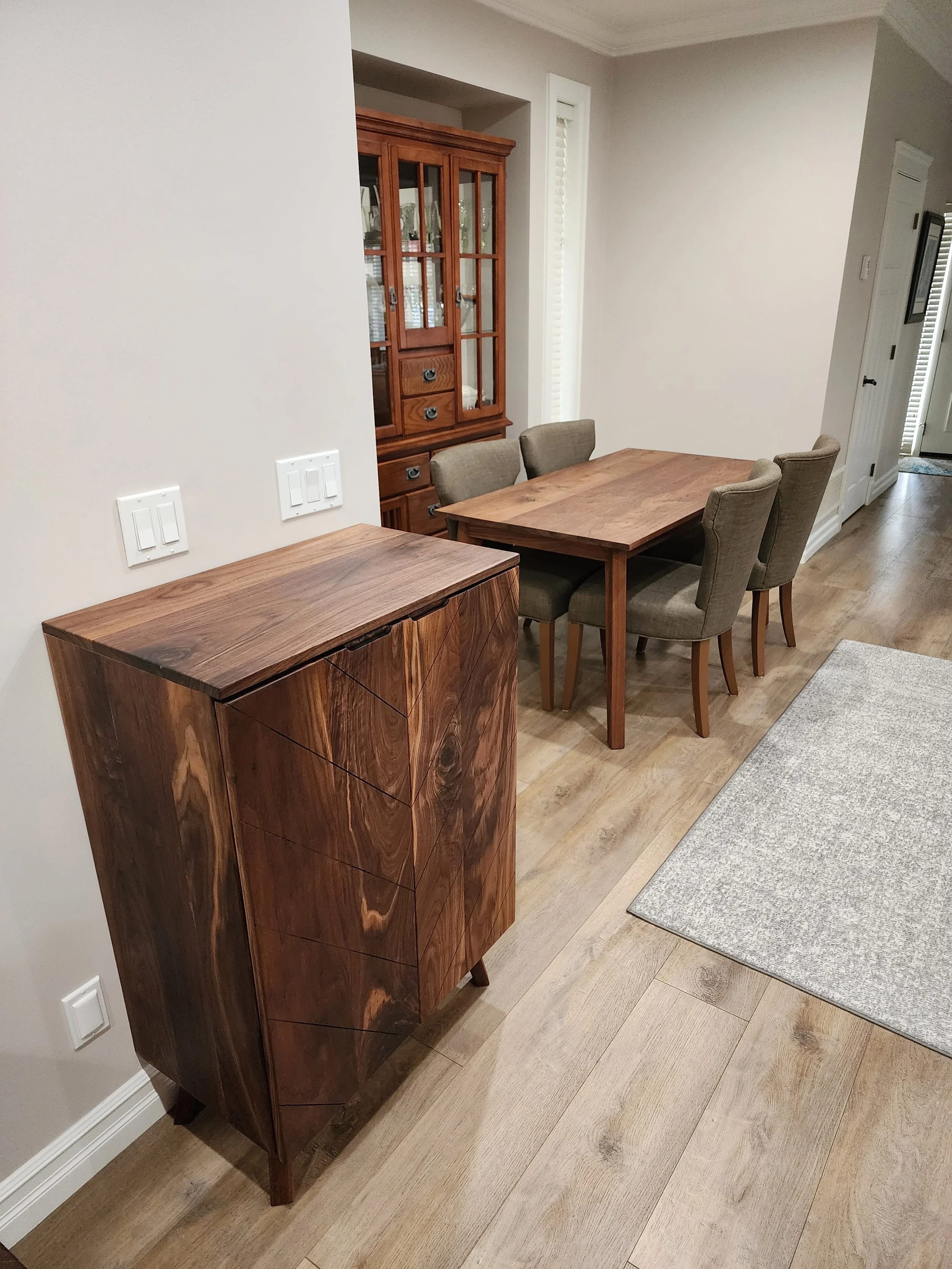 A beautiful mid-century cabinet for a returning client made of a solid black walnut body with decorative diagonal relief cuts. The base is made to match the client’s existing table.