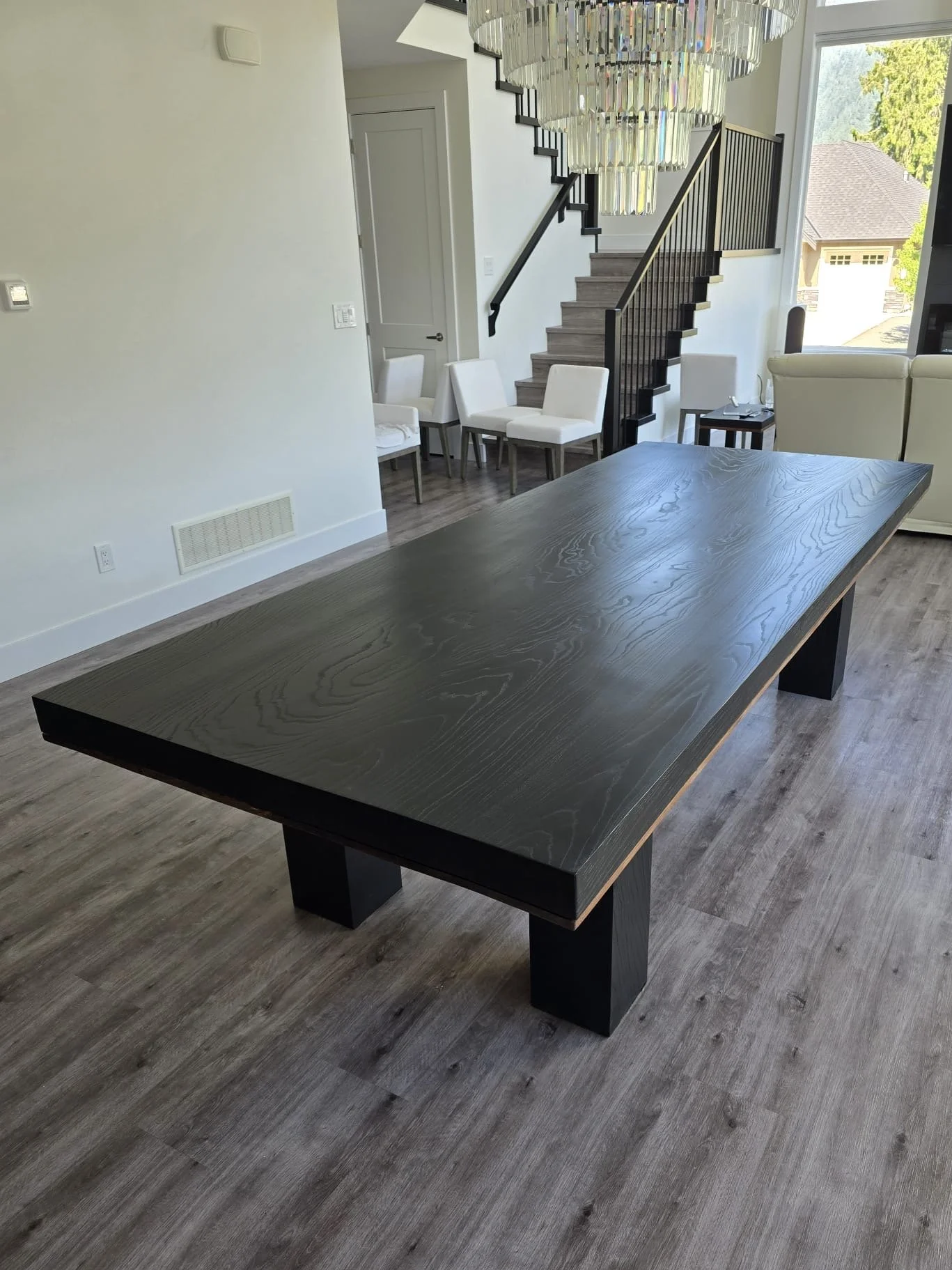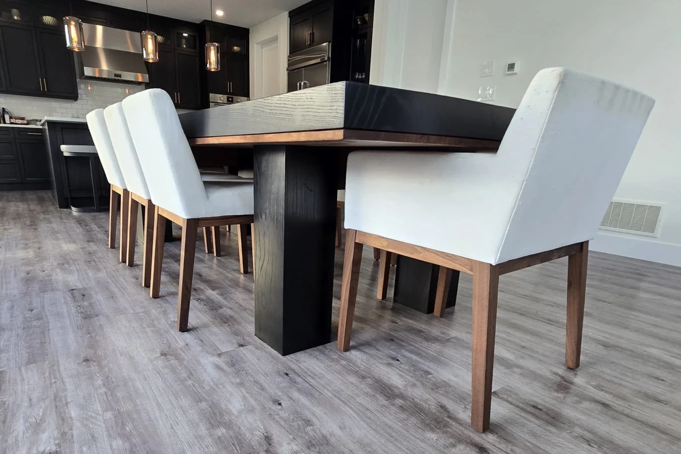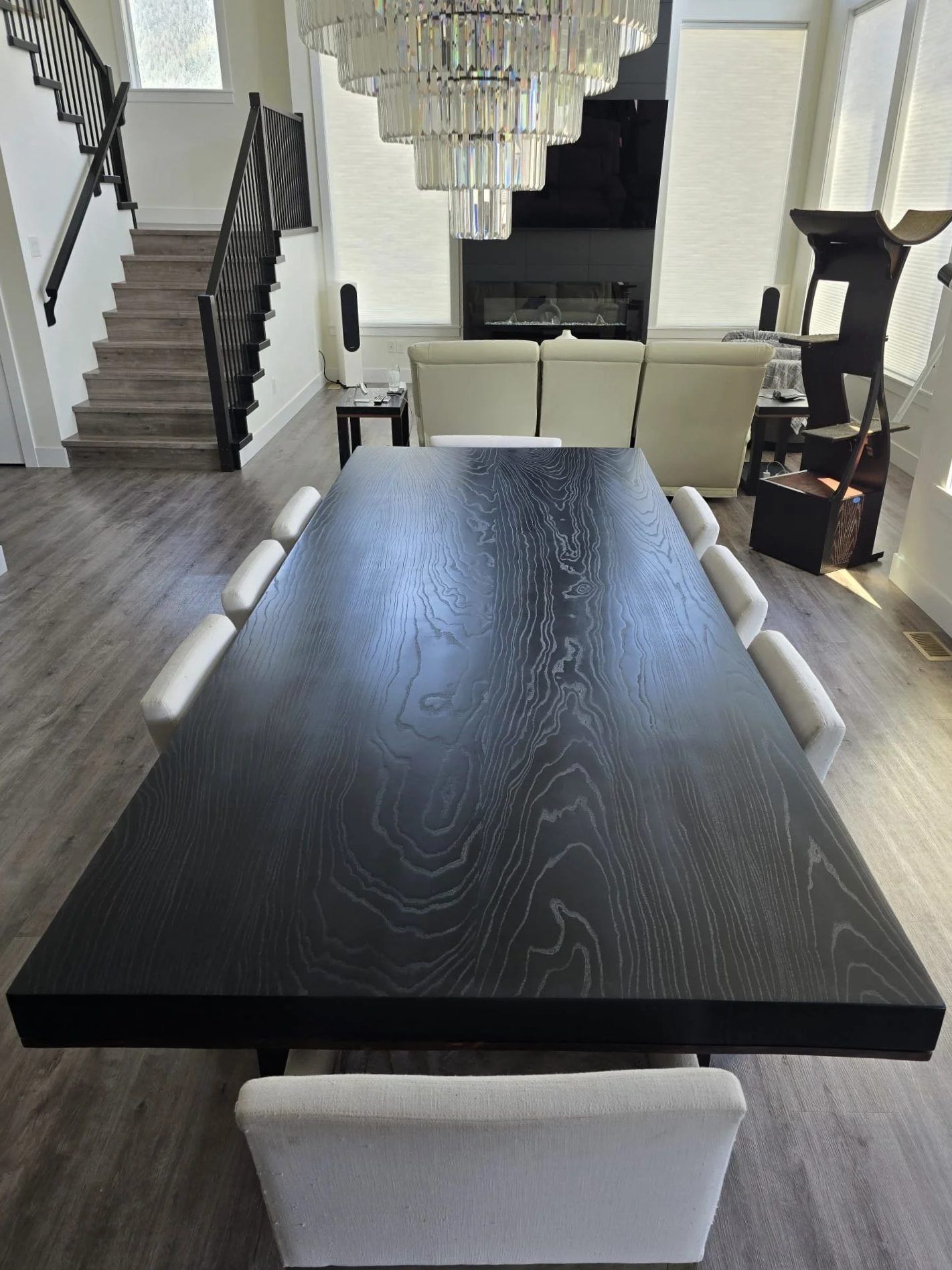 A combination of blackened ash and rich black walnut was used to create a cohesive set consisting of a 10ft dining table, a large coffee table and two matching end tables, all tied together with eight updated dining chairs.