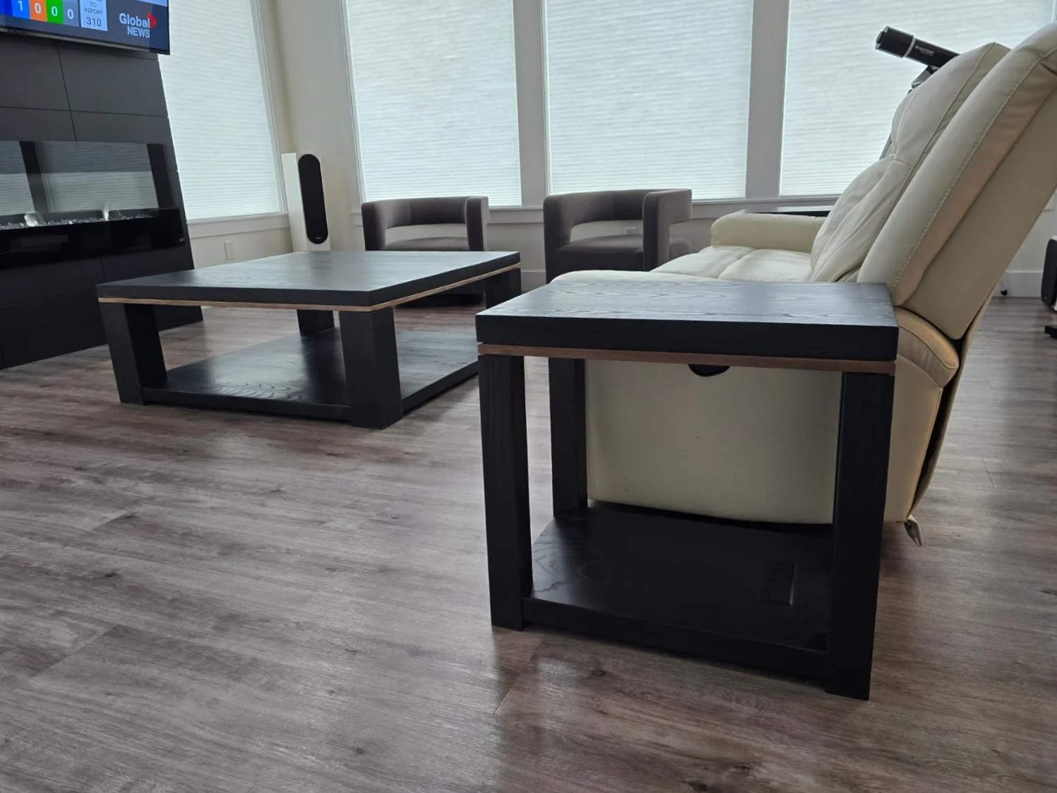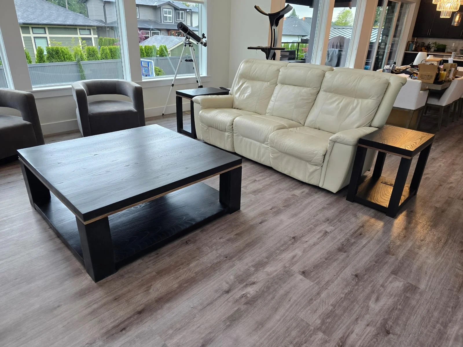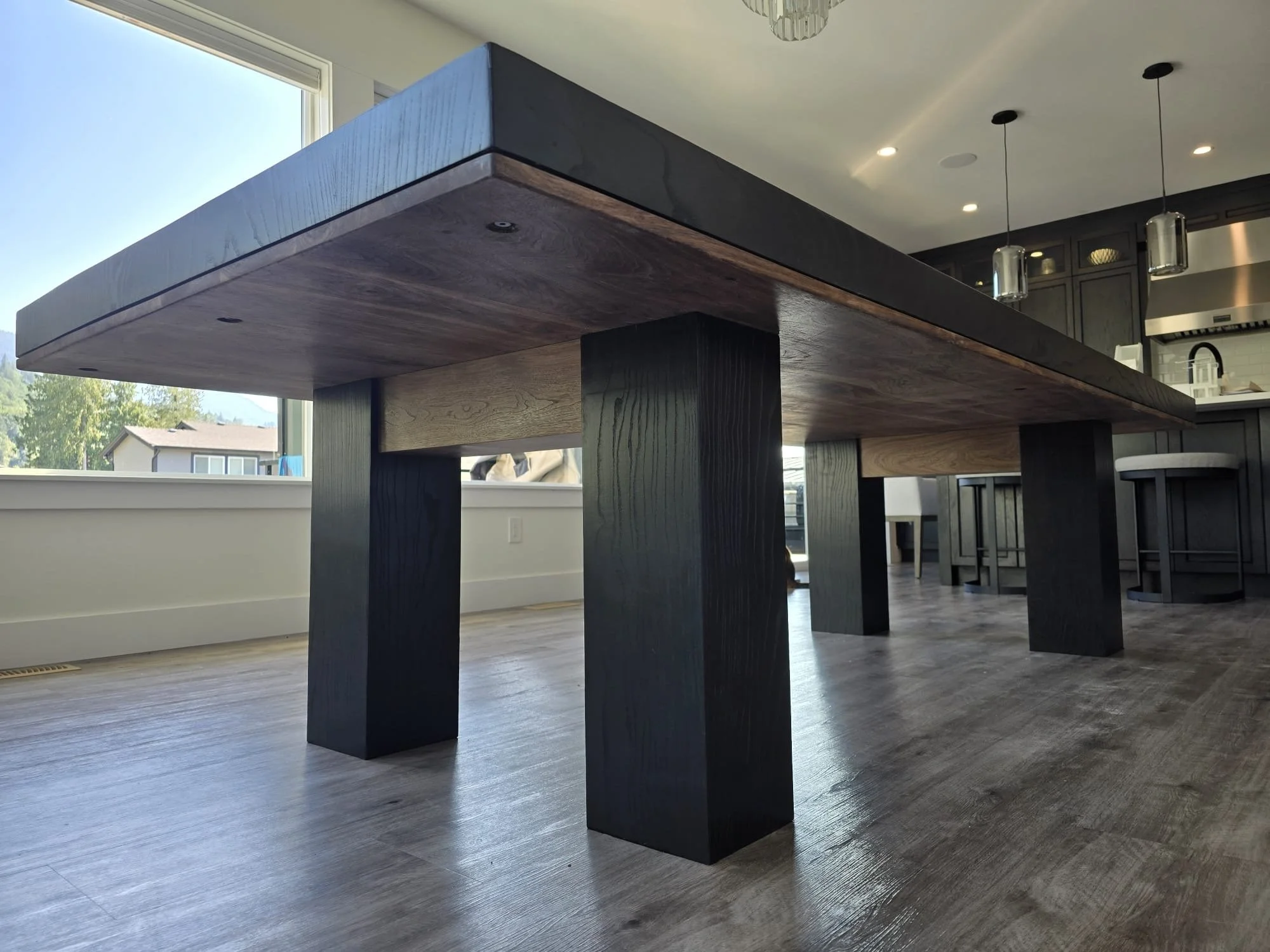 A combination of blackened ash and rich black walnut was used to create a cohesive set consisting of a 10ft dining table, a large coffee table and two matching end tables, all tied together with eight updated dining chairs.